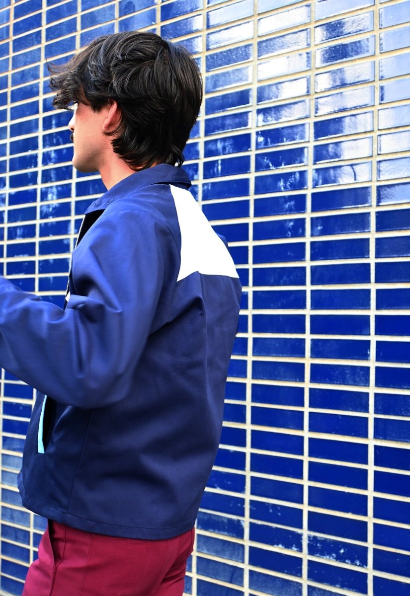 Este diseño de bloque de color presenta un cuerpo en tono azul marino medio con detalles en azul claro en los bolsillos ribeteados y en el interior de los puños, una solapa rosa en el bolsillo del pecho y un panel de yugo trasero blanco brillante.